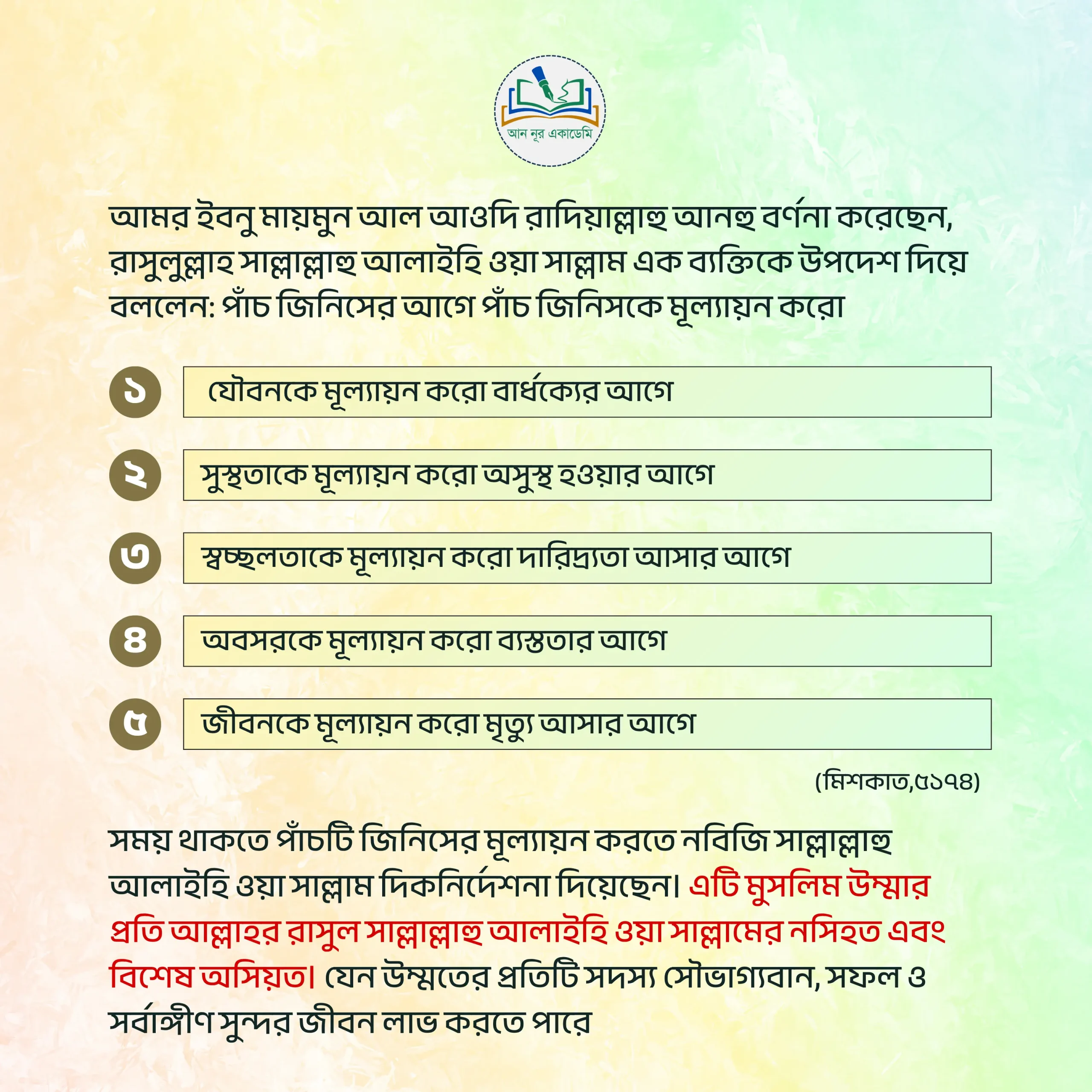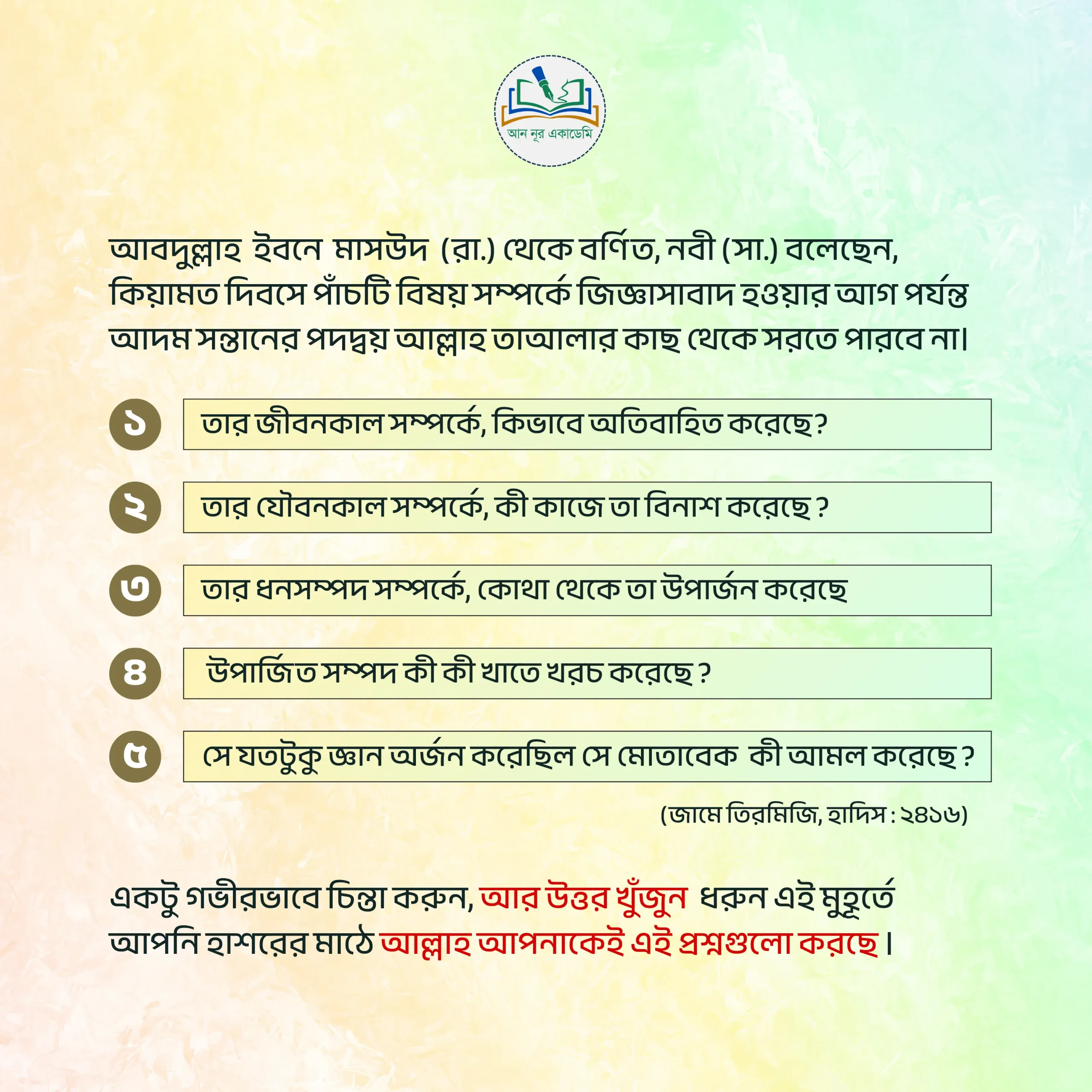 এখানে ইক্বরা, অর্থ: পড়ো। এ আয়াতের মাধ্যমে প্রত্যেক মুসমুলিমকে আল্লাহ জানিয়ে দিলেন তোমরা জানার জন্য, বোঝার জন্য এবং সঠিকটা মেনে চলার জন্য পড়া-লেখা করো, অধ্যয়ন করো। অর্থাৎ জ্ঞান অর্জন করা প্রত্যেক মুসলমানদের জন্য আল্লাহ তায়ালা ফরজ করে দিয়েছেন।